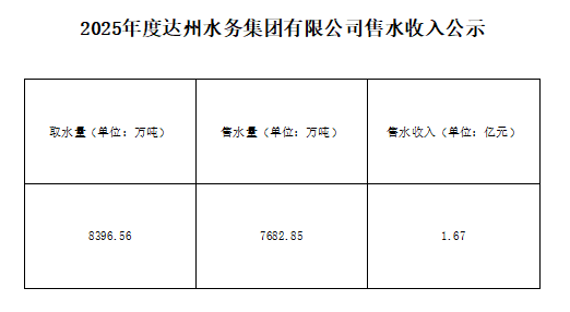 2025年度達(dá)州水務(wù)集團(tuán)有限公司售水收入公示