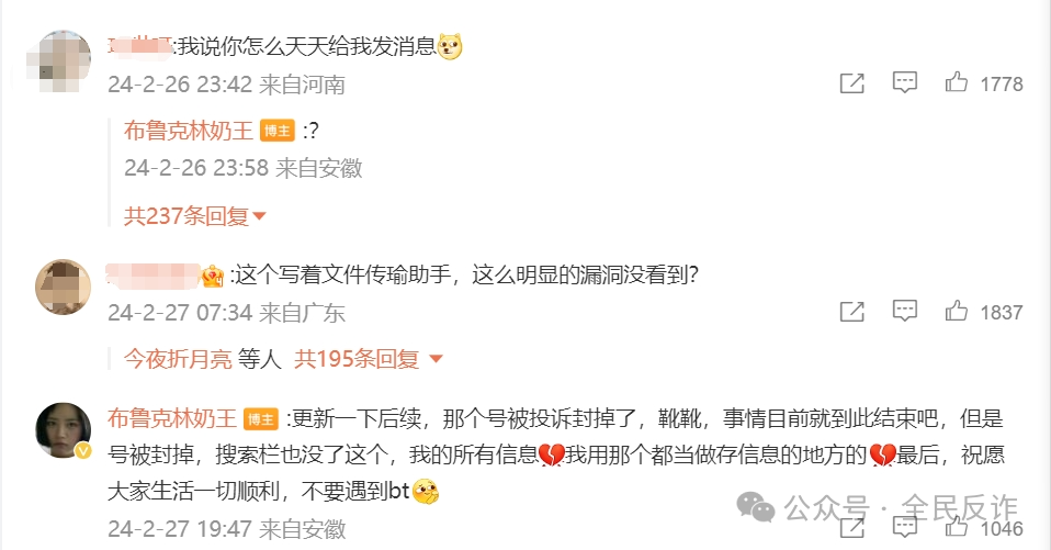 博主發(fā)帖后,在回復(fù)網(wǎng)友時(shí)告知事情進(jìn)展,她去報(bào)案后,警方?jīng)]受理,隨后她向微信平臺(tái)投訴,那個(gè)號(hào)被封了。“但是號(hào)被封掉,搜索欄也沒了,我的所有信息也沒有了”,她說(shuō)。