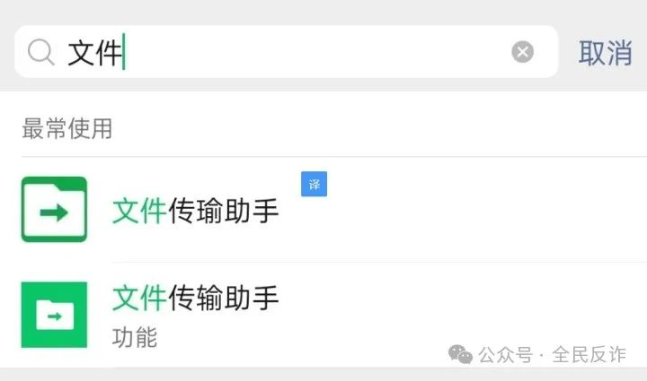 在實(shí)際操作中,我們?cè)谟脗鬏斨止δ芙o自己傳文件的時(shí)候,有時(shí)因?yàn)橐幌抡也坏?,?huì)在搜索框里輸入:文件,那么,有可能會(huì)錯(cuò)認(rèn)。