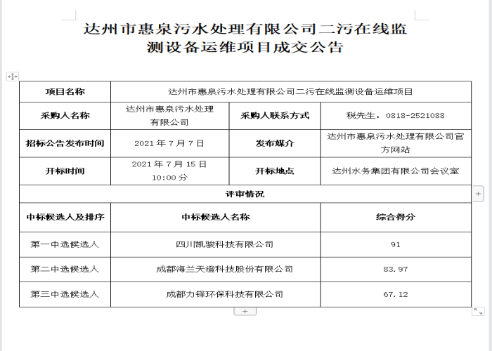 標題:達州市惠泉污水處理有限公司二污在線監(jiān)測設(shè)備運維項目成交公告